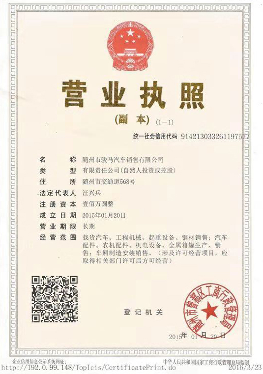 湖北骏马专用汽车有限公司办公室地址位于**专用汽车之都,世界四大古银杏群落之乡--随州,随州 随州市**道568号,于2015年01月20日在曾都区工商行政管理局注册成立,注册资本为100万元,在公司发展壮大的4年里,我们始终为客户提供好的产品和技术支持、健全的售后服务,我公司主要经营载货汽车、工程机械、起重设备、钢材销售;汽车配件、农机配件、机电设备、金属箱罐生产、销售;车厢制造安装销售。(涉及许可经营项目,应取得相关部门许可后方可经营),我们有好的产品和专业的销售和技术团队,我公司属于随州汽车、摩托车及零配件批发黄页行业,如果您对我公司的产品服务有兴趣,期待您在线留言或者来电咨询